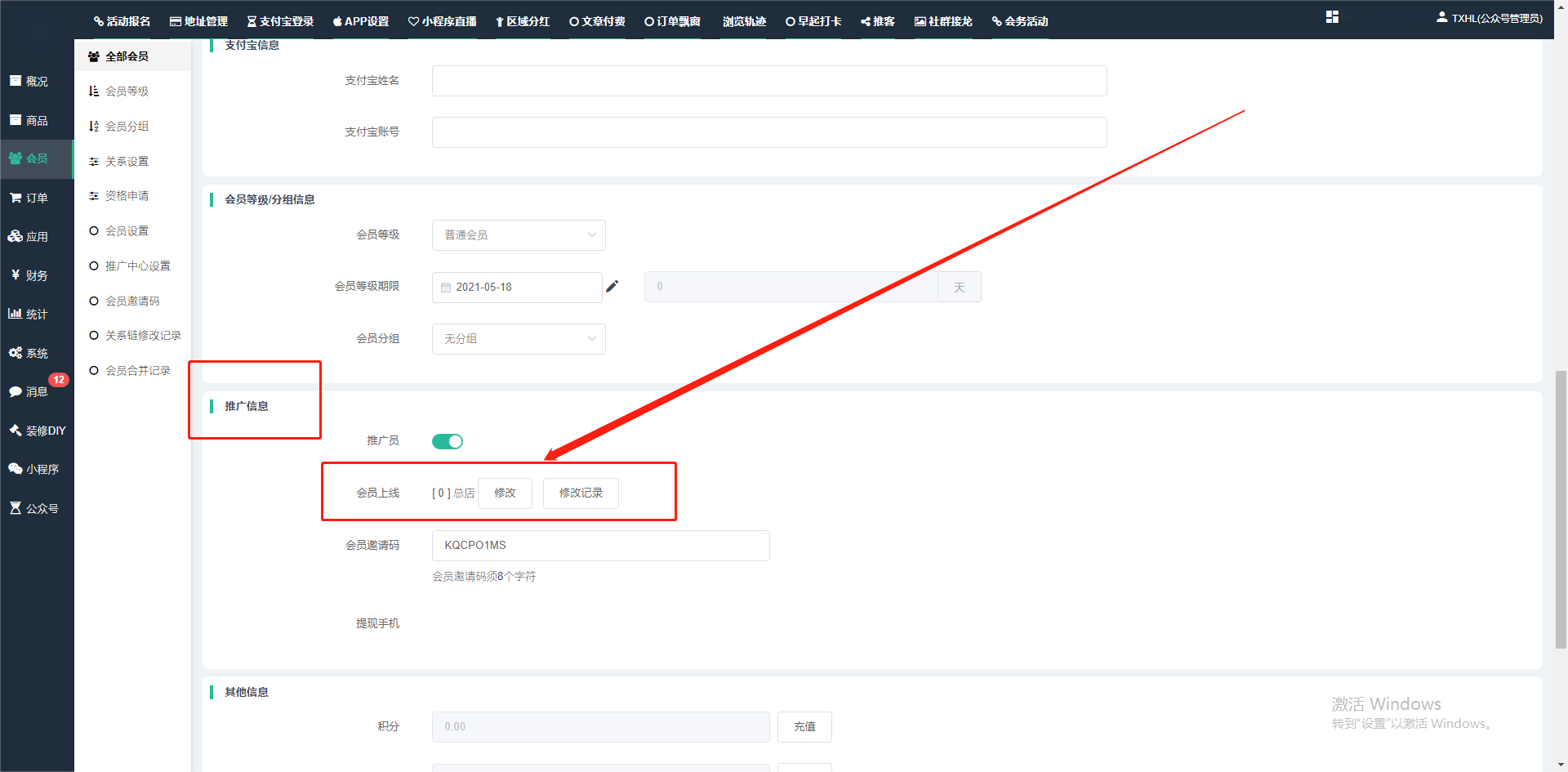 目录 搜索 展开 一、前期准备资料二、数字乡村码-上线操作指南1、服务号的申请流程及认证2、申请小程序流程3、开放平台绑定小程序和公众号三、数字乡村码-系统操作数字乡村码系统管理-概况数字乡村码-商品管理1、发布商品2、商品列表3、商品表单4、商品分类5、品牌管理6、配送模板7、评论管理8、优惠券管理9、商品标签10、退货地址设置11、满额优惠12、批量操作13、配送方式14、基础设置15、商品隐藏四、数字乡村码-会员管理1、全部会员2、会员等级3、会员分组4、资格申请5、会员设置6、推广中心设置7、会员邀请码8、会员关系链修改关系链修改记录9、会员合并记录10、账号注销管理11、会员设置中心五、数字乡村码-订单管理1、订单管理列表2、订单处理流程3、订单状态4、订单修改价格5、订单退款退货6、多包裹发货7、批量发货订单操作步骤8、催发货订单9、物流查询六、数字乡村码-财务管理1、余额设置2、会员余额3、充值记录4、转让记录5、余额明细6、收入明细7、提现设置8、提现统计9、积分管理10、转账审核11、收益广告12、批量充值七、数字乡村码-系统管理1、商城入口2、商城设置①、商城设置②、订单设置③、物流查询④、短信⑤、联系方式⑥、分类⑦、优惠券⑧、分享⑨、幻灯片⑩、广告位⑫、地图设置3、交易设置4、微信模板消息自定义消息模板(新版)自定义消息模板(旧版)小程序消息模板公众号模板消息变更公告5、语言设置6、权限管理7、多媒体管理八、数字乡村码-消息管理九、数字乡村码-应用管理十、数字乡村码系统-数据统计十一、数字乡村码-页面装修DIY1、模板管理2、店铺页面3、顶部导航4、底部导航5、DIY模板市场6、首屏广告7、基础设置8、装修DIY尺寸建议十二、供应商功能插件操作指南1、供应商2、门店-收银台门店申请和使用步骤门店管理①、门店-收银台 营销设置②、门店-收银台 分润设置门店分类门店申请门店审核门店商品门店商品订单收银台订单数据统计核销员基础设置默认设置门店装修3、微社区4、会务活动十三、营销插件操作指南活动报名提货卡新人奖微店问卷调查积分视频分享1、视频分享基础设置2、视频分享发现管理3、视频分享分类管理4、视频分享评论管理5、视频分享分红记录6、视频分享短视频中心每日红包幸运大抽奖签到优惠券二维码任务奖励优惠劵文章音频文章付费文章限时购新海报拓客卡操作流程积分活动素材中心视频红包十四、入驻门店应用类1、门店预约2、附近商品3、门店定位设置4、门店控制5、门店满额包邮6、门店满额减7、导入商品8、门店搜索9、门店股东10、核销券11、多门店核销1、商城后台设置2、前端功能演示十五、常见问题1、后台登录密码修改流程2、会员-余额,积分,后台如何进行充值与扣除3、如何修改上下级关系4、一种万能的获取商城小程序路径的方法 暂无相关搜索结果! 阅读次数:1421 本文档使用 模王系统 发布 3、如何修改上下级关系 如何修改上下级关系一.如何修改上下级关系?1.会员-全部会员-可以通过搜索用户的独立ID,或者用户微信昵称,找到此会员,然后点击右边的(操作)2.再点击会员详情。3.滑到下面,有个推广信息-会员上线,点击修改4.输入上级的ID号,点击搜索,出来此上级会员后点击选择。5.滑到最下面,一定要点击提交按钮。文档更新时间: 2024-01-05 14:50 作者:链上旅行