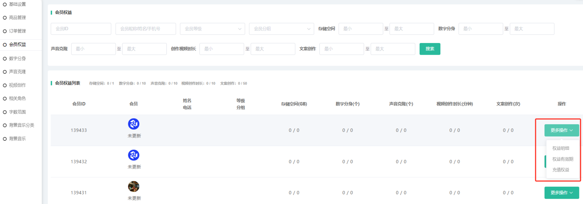 展示商城会员所有的权益信息,可对会员进行查看权益明细,权益有效期、充值权益操作