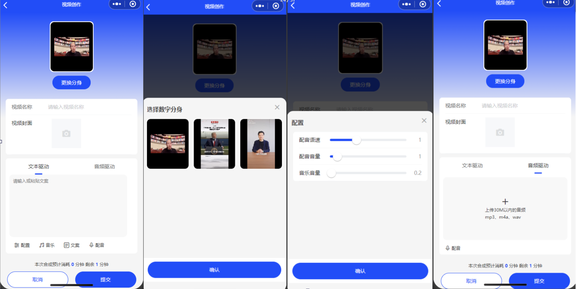 根据要求创建一个合成视频,选择数字分身和声音,输入文案